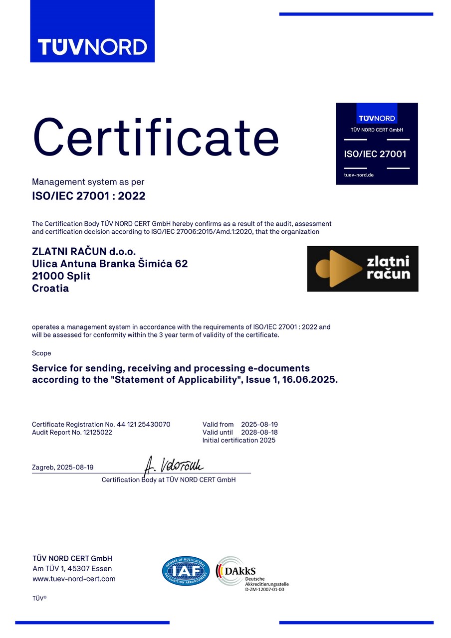 Zlatni e račun je certificirani servis za razmjenu elektroničkih dokumenata. Službeno smo odobreni od Ministarstva Gospodarstva Kao “informacijski posrednik” te smo usklađeni sa svim EU normama (EN 16391).